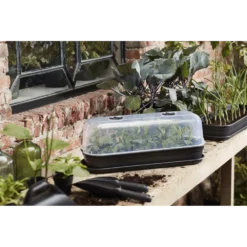 Kweek nu makkelijk je eigen groenten en kruiden met het green basics kweekhuis van elho. Dit product is speciaal ontwikkeld in combinatie met de elho kweekbak en schotel, zo creëer je optimaal groeiresultaat voor alle planten, kruiden en groentes. Een onmisbaar product tijdens het moestuin kweekproces; de zaadjes en planten gaan hier daadwerkelijk harder van groeien. De kap is voorzien van een handig ventilatieschijfje waarmee je de luchtcirculatie zelf kan regelen en de temperatuur kan aanpassen. Daarnaast zorgt de kap ervoor dat ongedierte niet bij de jonge planten/zaadjes komen. Het kweekhuis is in drie formaten verkrijgbaar. Alle producten uit de green basics collectie zijn gemaakt van gerecycled kunststof. Je kan de kap zonder problemen in de zon zetten, de Uv-filter zorgt ervoor dat planten niet verbranden. Daarnaast is hij onderhoudsvriendelijk en gemakkelijk schoon te maken.